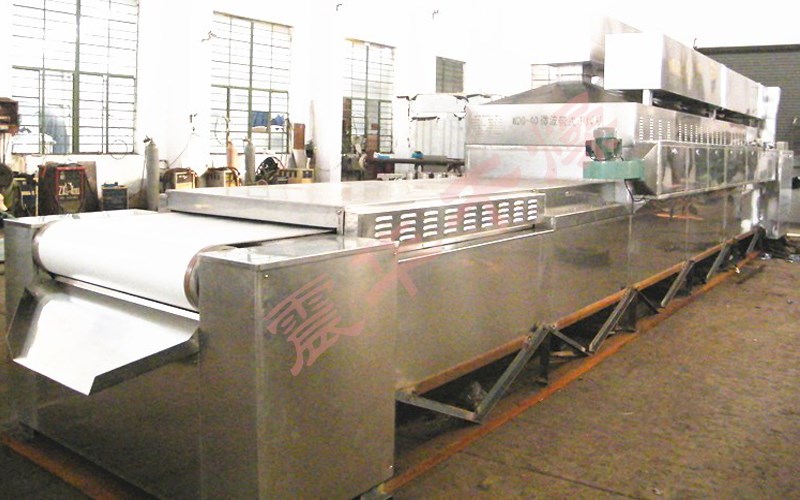 微波帶式干燥滅菌機(jī),基本原理是物料由加料器均勻地鋪在專用履帶上,由傳動(dòng)裝置拖動(dòng)在機(jī)內(nèi)移動(dòng)。因設(shè)備上方安裝有許多微波發(fā)射裝置。當(dāng)物料移動(dòng)到微波發(fā)射區(qū)域內(nèi)。物料中的水份就會(huì)在微波作用下,相互摩擦生熱而蒸發(fā),而水汽不斷被抽走達(dá)到干燥作用。物料內(nèi)的細(xì)菌,在微波作用下,其分子受到上億次微波頻率的高速極化,使細(xì)菌的細(xì)胞膜很快破裂而亡。起到很好的滅菌效果。