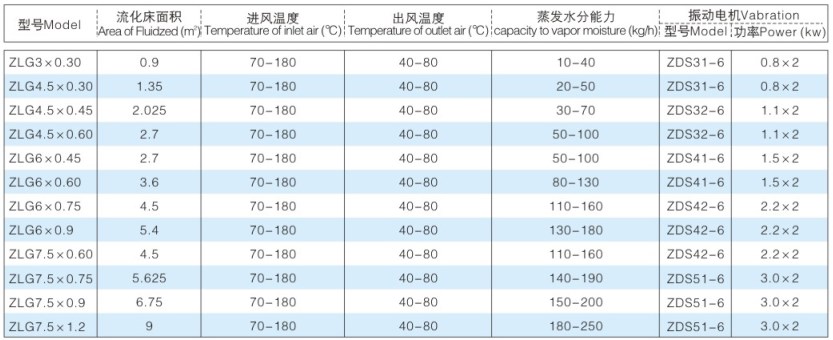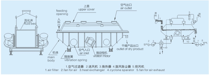 目前應用廣泛的臥式振動流化床干燥機,形狀和基本結構與普通臥式流化床干燥機很相似。區別在于振動流化床整個機體通過彈簧支撐在底座上,多孔板稍向出料端傾斜,機體一側或兩側裝有振動電機。物料依靠機械振動和穿孔氣流雙重作用流化,并在振動作用下向前運動。物料自進料口進入機內,在振動力作用下,物料沿水平方向拋擲向前連續運動,熱風向上穿過流化床同濕物料換熱后,濕空氣經旋風分離器除塵后由排風口排出;干燥物料由排料口排出。