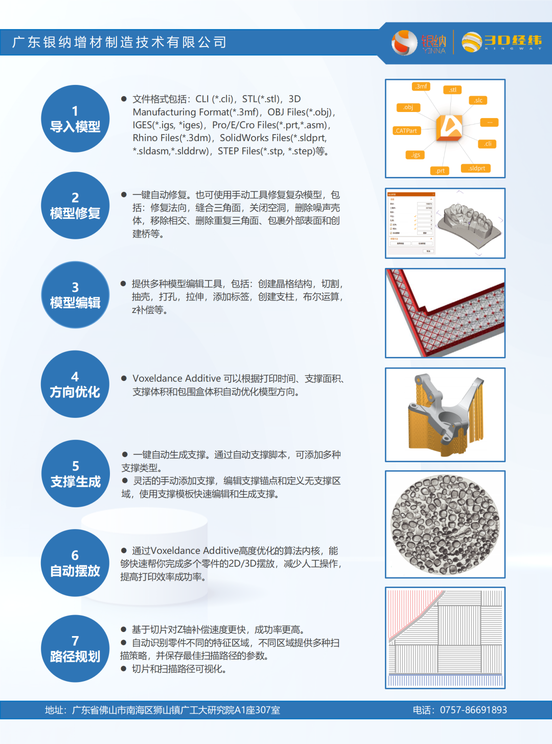 廣東銀納SLA光固化成型設(shè)備采用漫格科技VoxelDance Additive作為數(shù)據(jù)準(zhǔn)備軟件,該軟件具備了3D打印數(shù)據(jù)前處理所需要的所有功能,并能很好地解決模型修復(fù)、支撐的創(chuàng)建等問題,得到了用戶的高度贊譽(yù)。